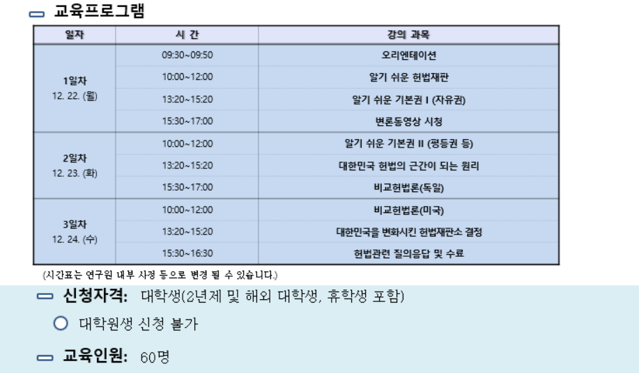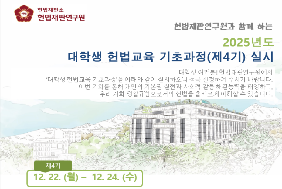 헌법재판연구원에서 대학생 헌법교육 기초과정 제4기에 참여하실 대학생들을 모집합니다.